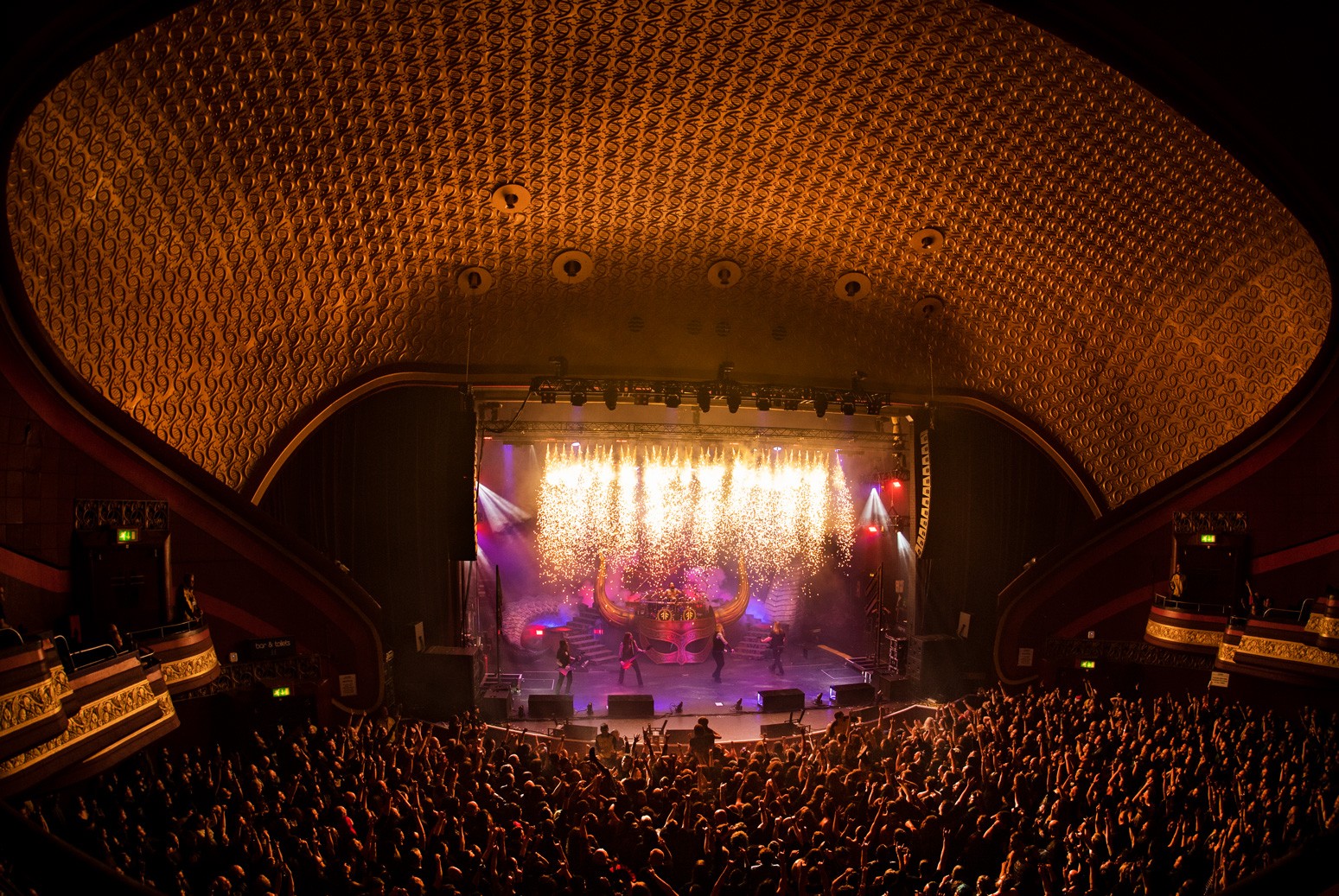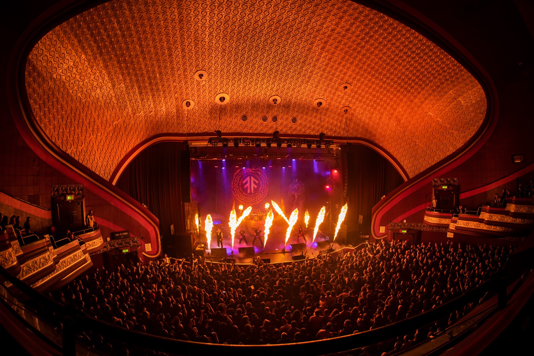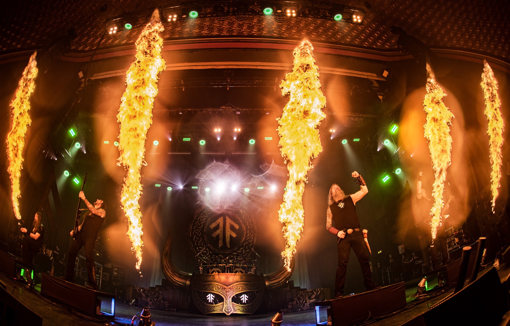 There is a theatrical weight to their live show. Norse mythology runs through the music, but it is never costume alone. It is conviction. The movements are deliberate. The stance wide and grounded. Guitars held like extensions of the body rather than props. From behind the camera, I am watching for structure within that intensity. The moment the flames rise. The split second before a synchronised headbang lands. The silhouettes cut sharply against backlight.