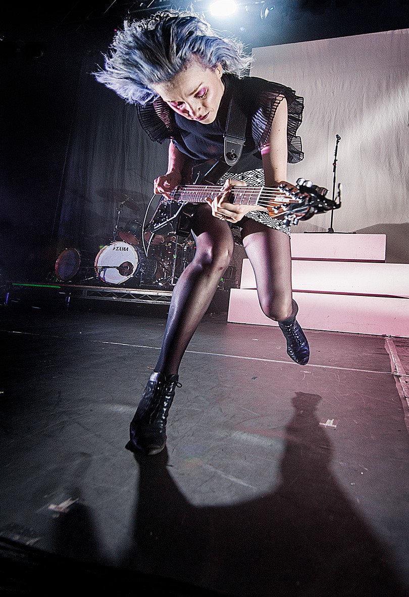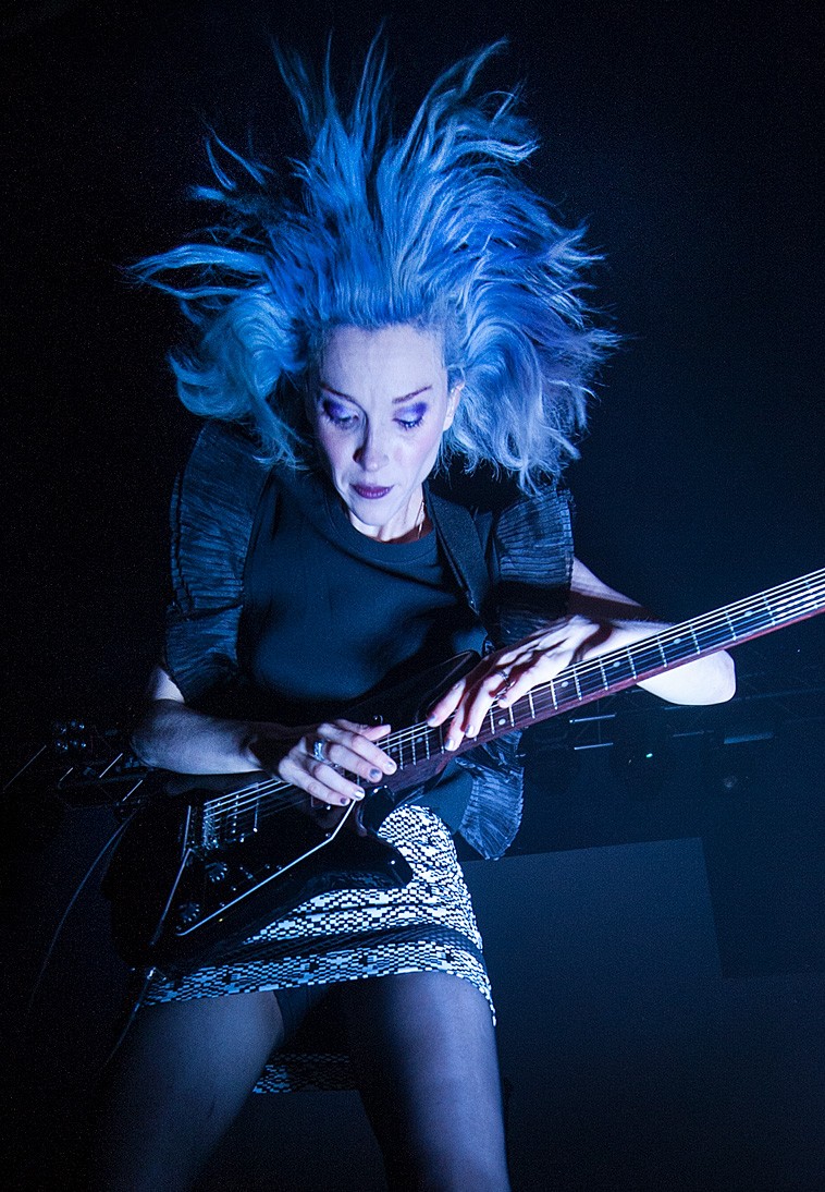 A narrow beam cut across the stage before the first guitar line broke through. The lighting design was precise and architectural, carving the space into clean planes rather than flooding it. St Vincent moved with intention, shifting between stillness and abrupt, angular gestures that mirrored the sound.