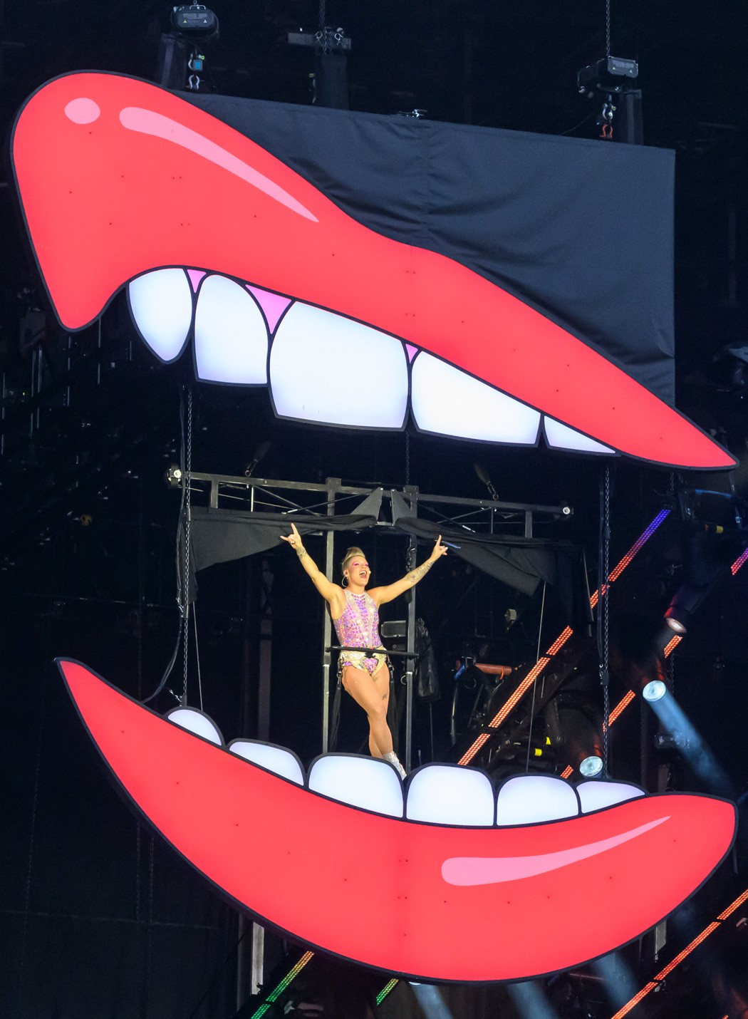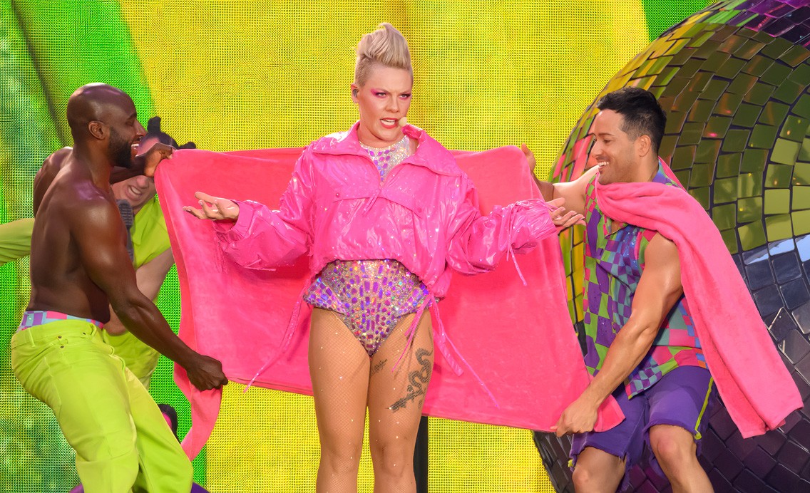 The Birmingham date formed part of the Summer Carnival Tour, designed around spectacle and momentum. Pink moved between grounded band sections and extended aerial runs above the stadium floor, keeping the crowd engaged across every tier.