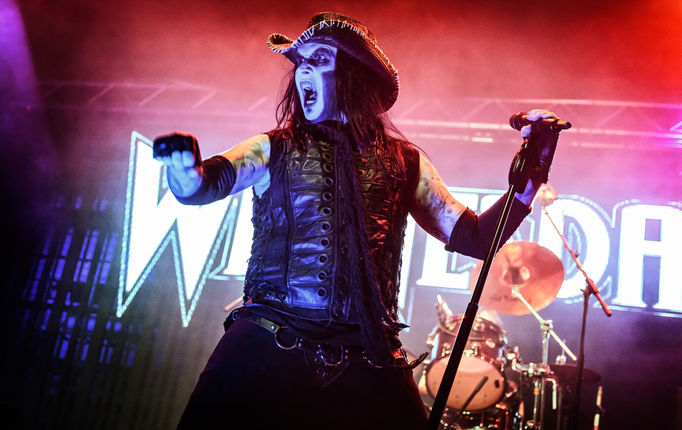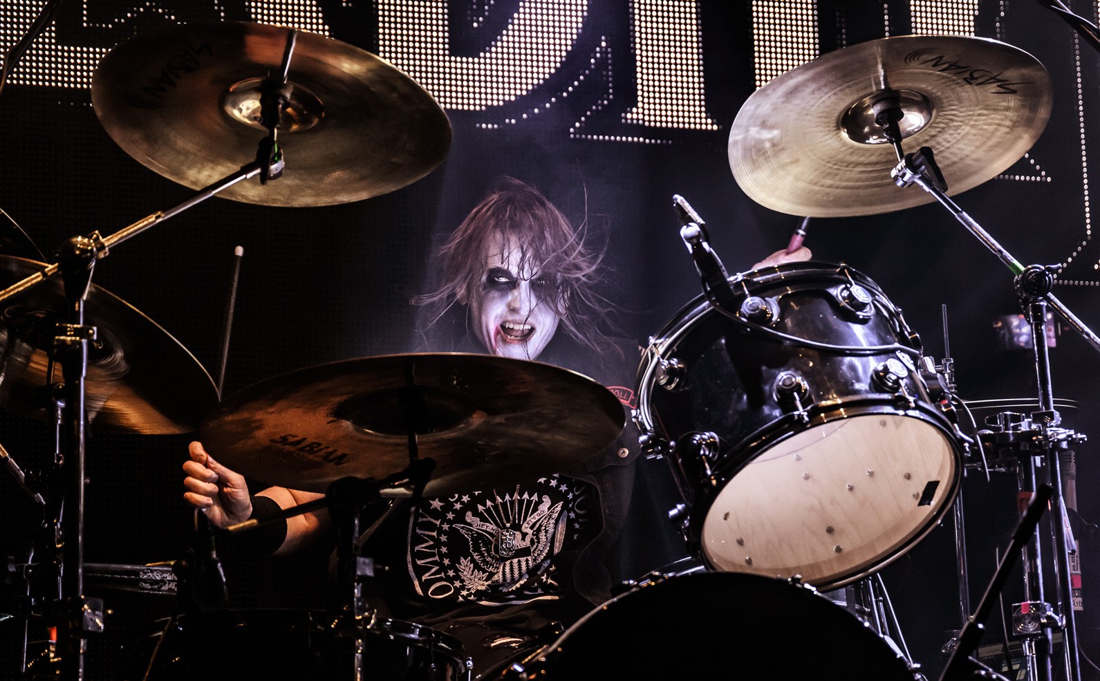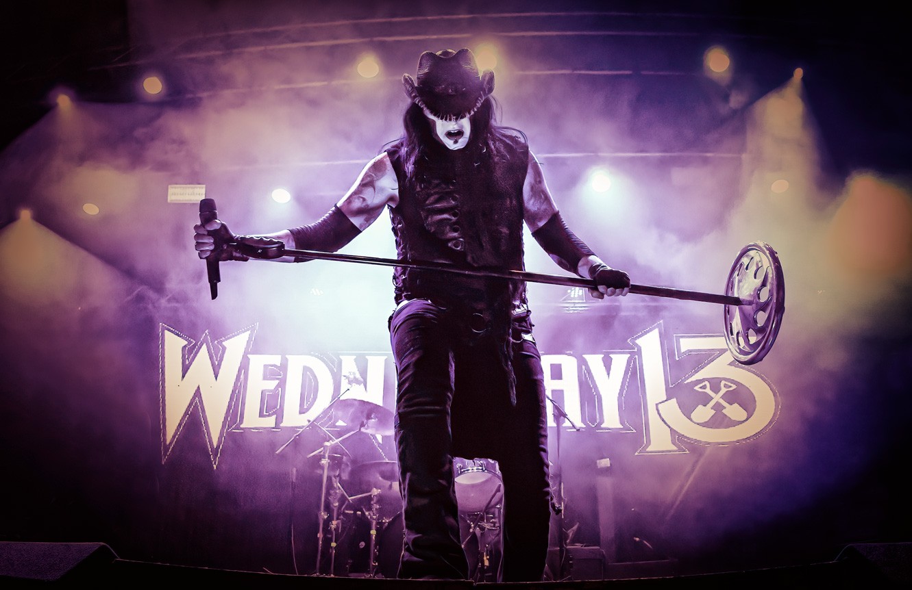 Green backlight and drifting smoke set a deliberate tone before the first riff hit. The aesthetic leaned into gothic theatrics, with props, makeup and shadow shaping the frame as much as the music. Wednesday 13 held centre stage, using exaggerated gesture and controlled pacing to build atmosphere.